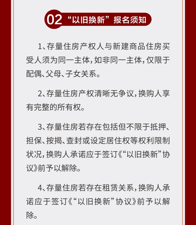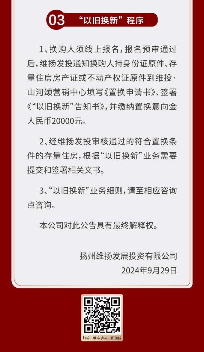 住房“以舊換新”“以房換房”是各地房地產(chǎn)新政中以“小細節”撬動(dòng)“大市場(chǎng)”的重要舉措。維揚發(fā)投積極響應政府新推行的“以舊換新”政策,踐行“惠民”理念,整合各項資源,搭建換房中心平臺,為買(mǎi)房人提供一站式以舊換新置換服務(wù),推動(dòng)激活邗江區商品房市場(chǎng)活力。 此次維揚發(fā)投“以舊換新”工作以其自主開(kāi)發(fā)的維投·山河頌項目為試點(diǎn),由國企背書(shū)、置換范圍廣、全流程專(zhuān)業(yè)服務(wù)。首批換購新建商品住房限額50套,換購人可通過(guò)登錄“維揚發(fā)投商品住房‘以舊換新’線(xiàn)上報名系統”報名,具體要求詳見(jiàn)公告。